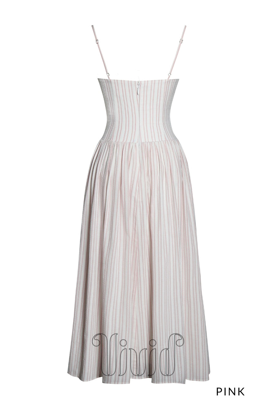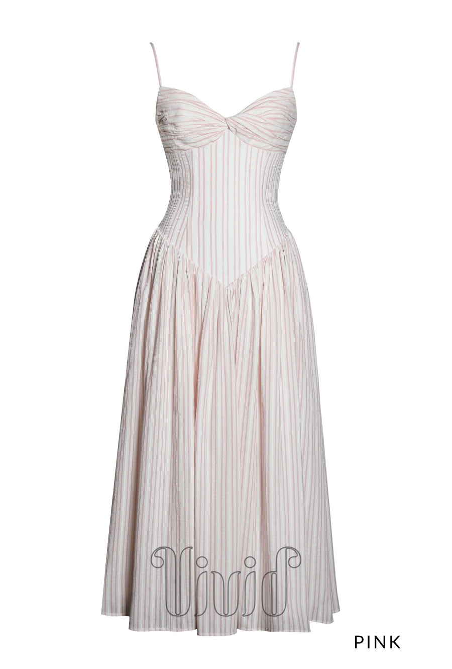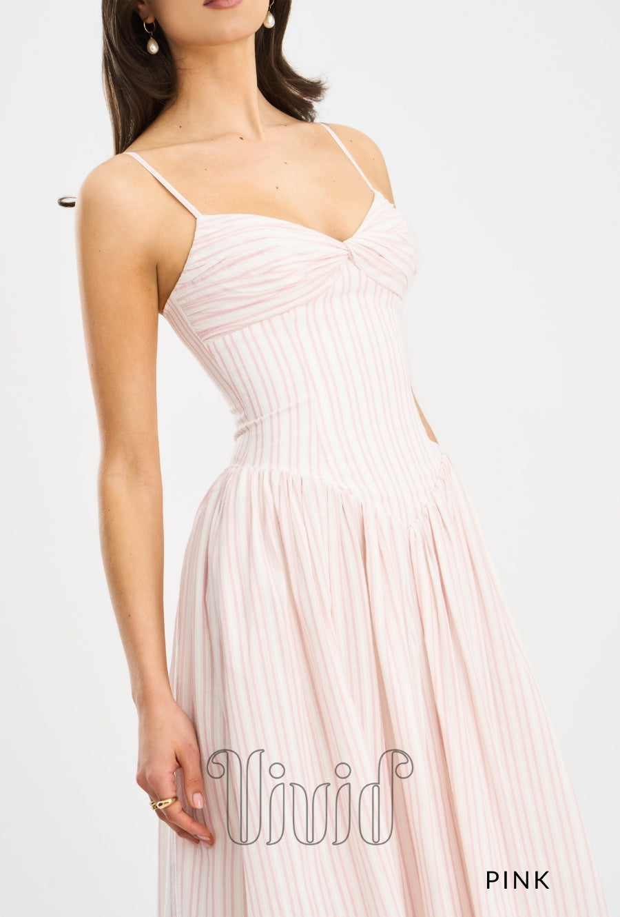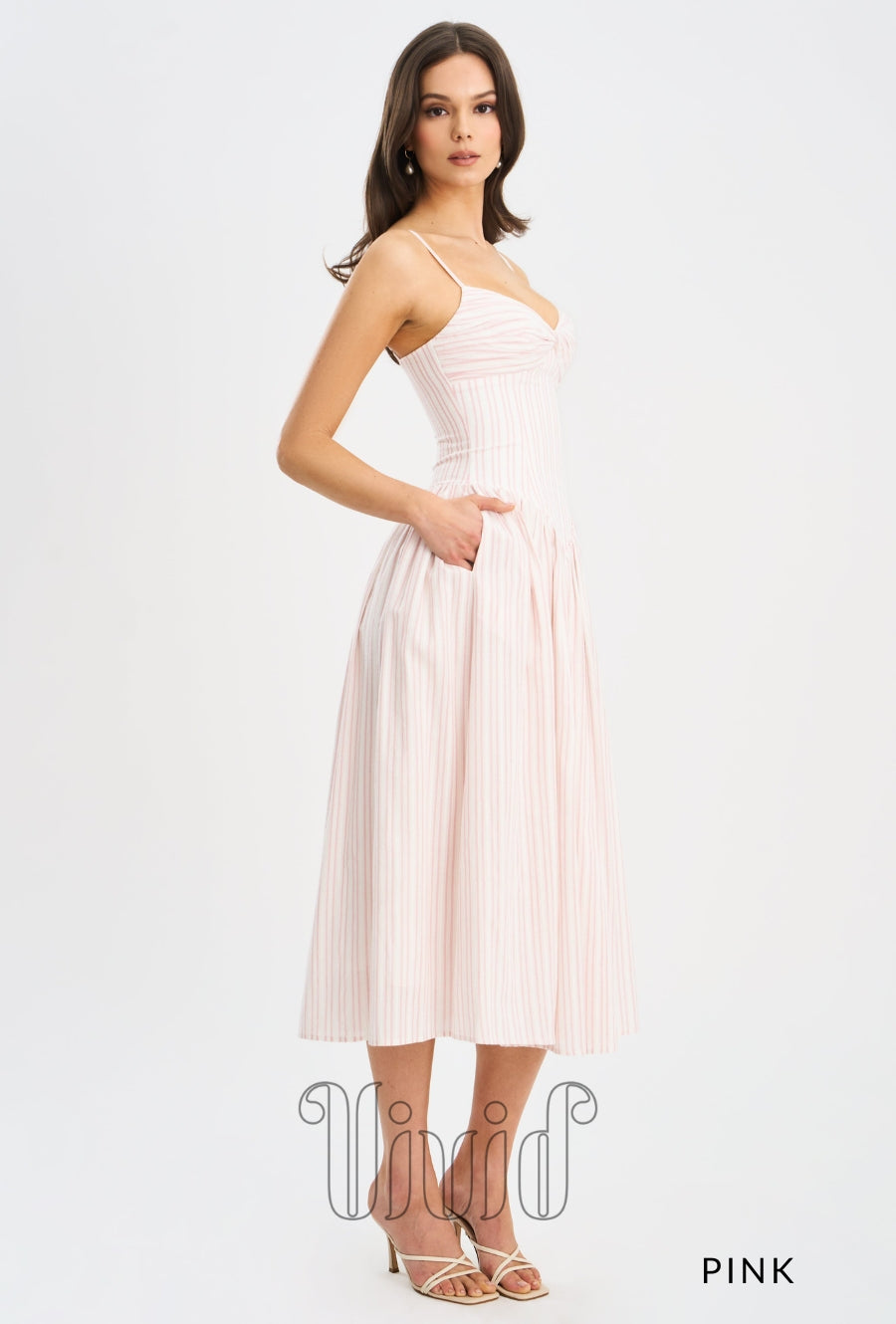 Charming and effortlessly flattering, the Candy Dress features a ruched bodice and a soft pink and white stripe pattern enhanced by delicate woven detailing. The drop waist and V-shaped waistline sculpt the figure beautifully, supported by built-in boning for added structure. Designed with adjustable straps, practical pockets, and an invisible zipper, this midi-length dress is fully lined for comfort and elegance. A timeless piece perfect for warm days, garden parties, or casual chic occasions.