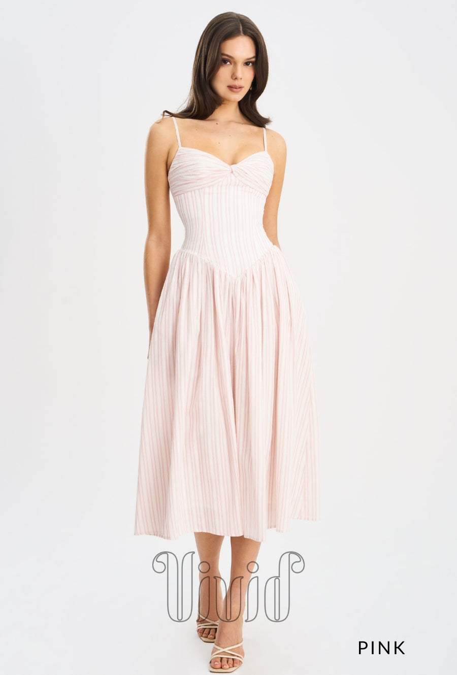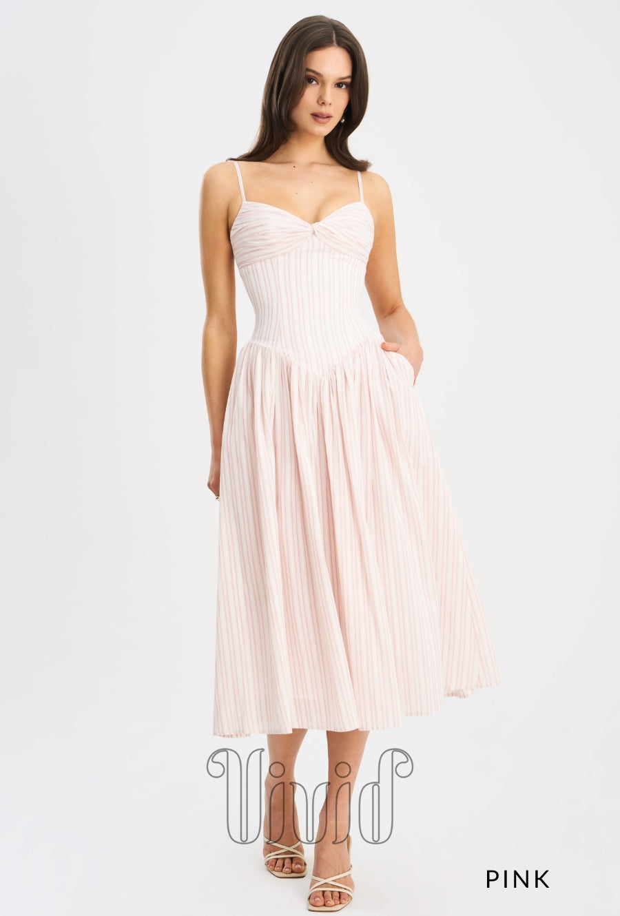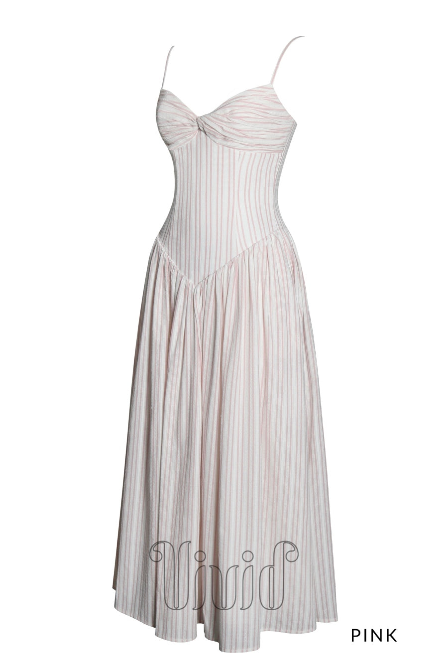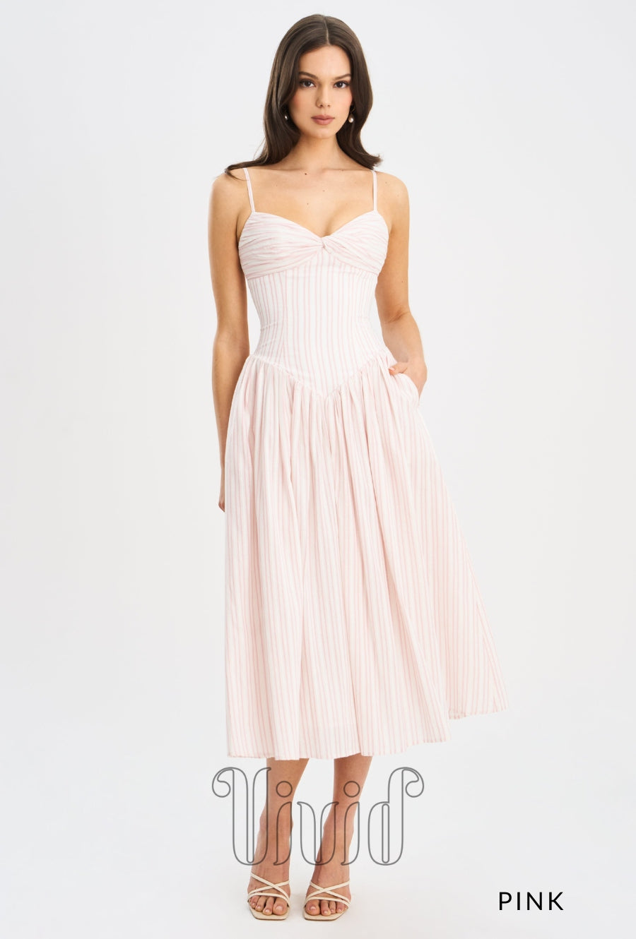 Charming and effortlessly flattering, the Candy Dress features a ruched bodice and a soft pink and white stripe pattern enhanced by delicate woven detailing. The drop waist and V-shaped waistline sculpt the figure beautifully, supported by built-in boning for added structure. Designed with adjustable straps, practical pockets, and an invisible zipper, this midi-length dress is fully lined for comfort and elegance. A timeless piece perfect for warm days, garden parties, or casual chic occasions.