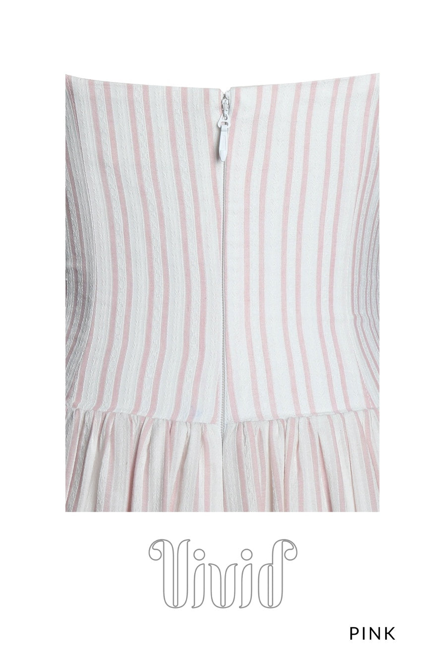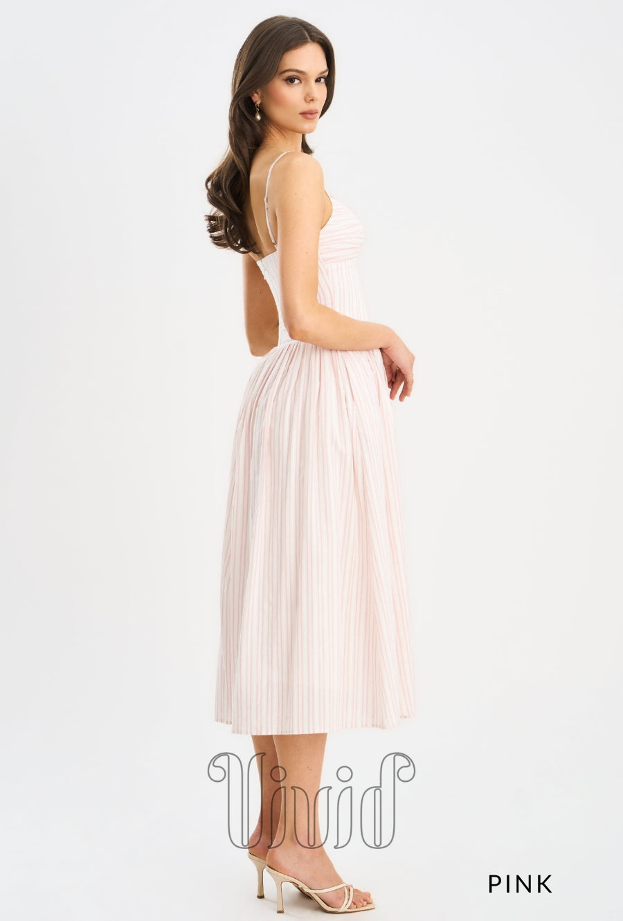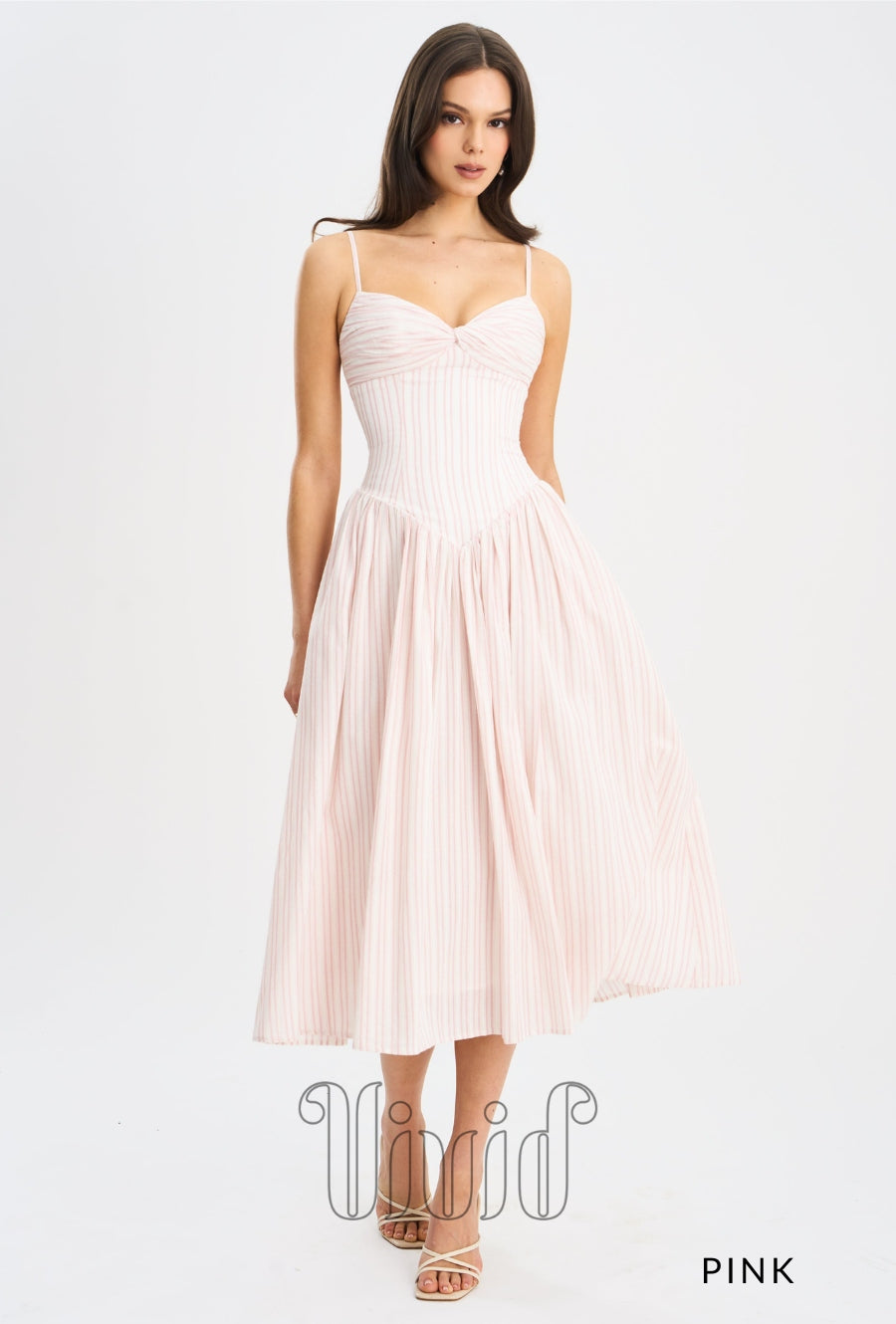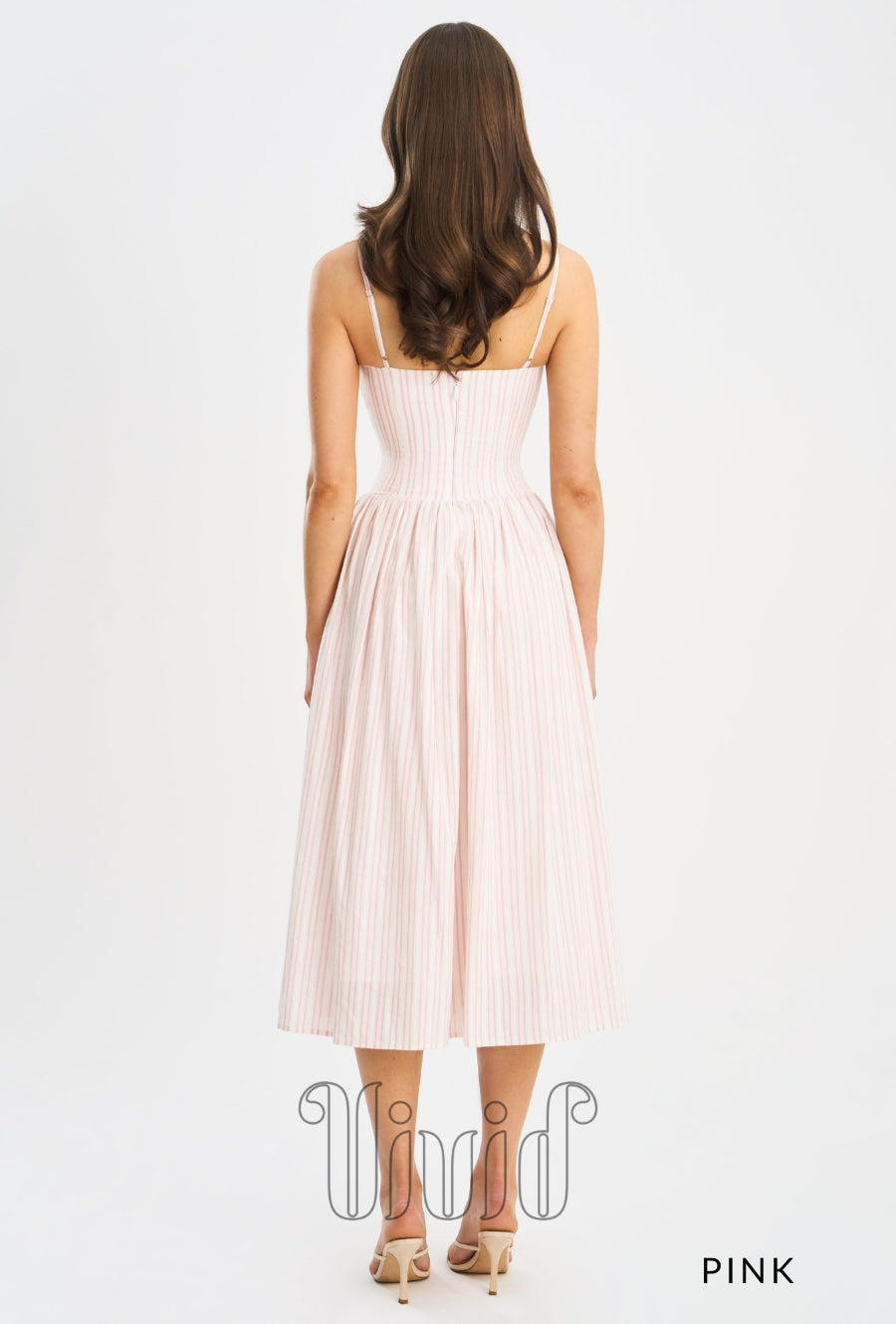 Charming and effortlessly flattering, the Candy Dress features a ruched bodice and a soft pink and white stripe pattern enhanced by delicate woven detailing. The drop waist and V-shaped waistline sculpt the figure beautifully, supported by built-in boning for added structure. Designed with adjustable straps, practical pockets, and an invisible zipper, this midi-length dress is fully lined for comfort and elegance. A timeless piece perfect for warm days, garden parties, or casual chic occasions.