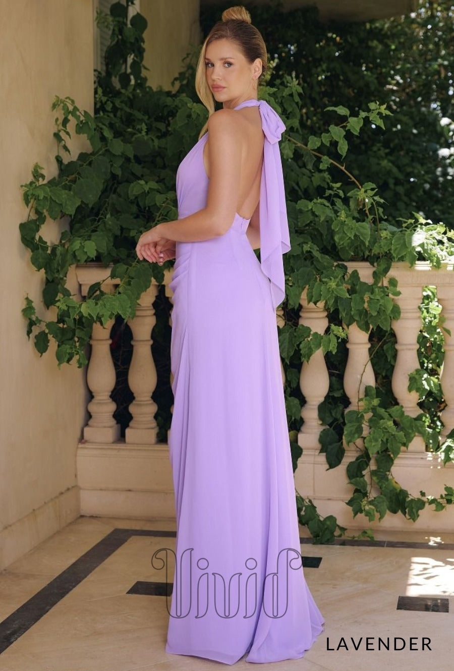 Elegant and effortlessly flattering, this halter chiffon gown features a plunging neckline with softly gathered draping along the waist and hips. The floor-length skirt flows beautifully with every step, while a side split adds a touch of modern edge. Finished with a self-tie bow at the neck and a sleek open back, this dress is perfect for weddings, proms, or sunset soirées.