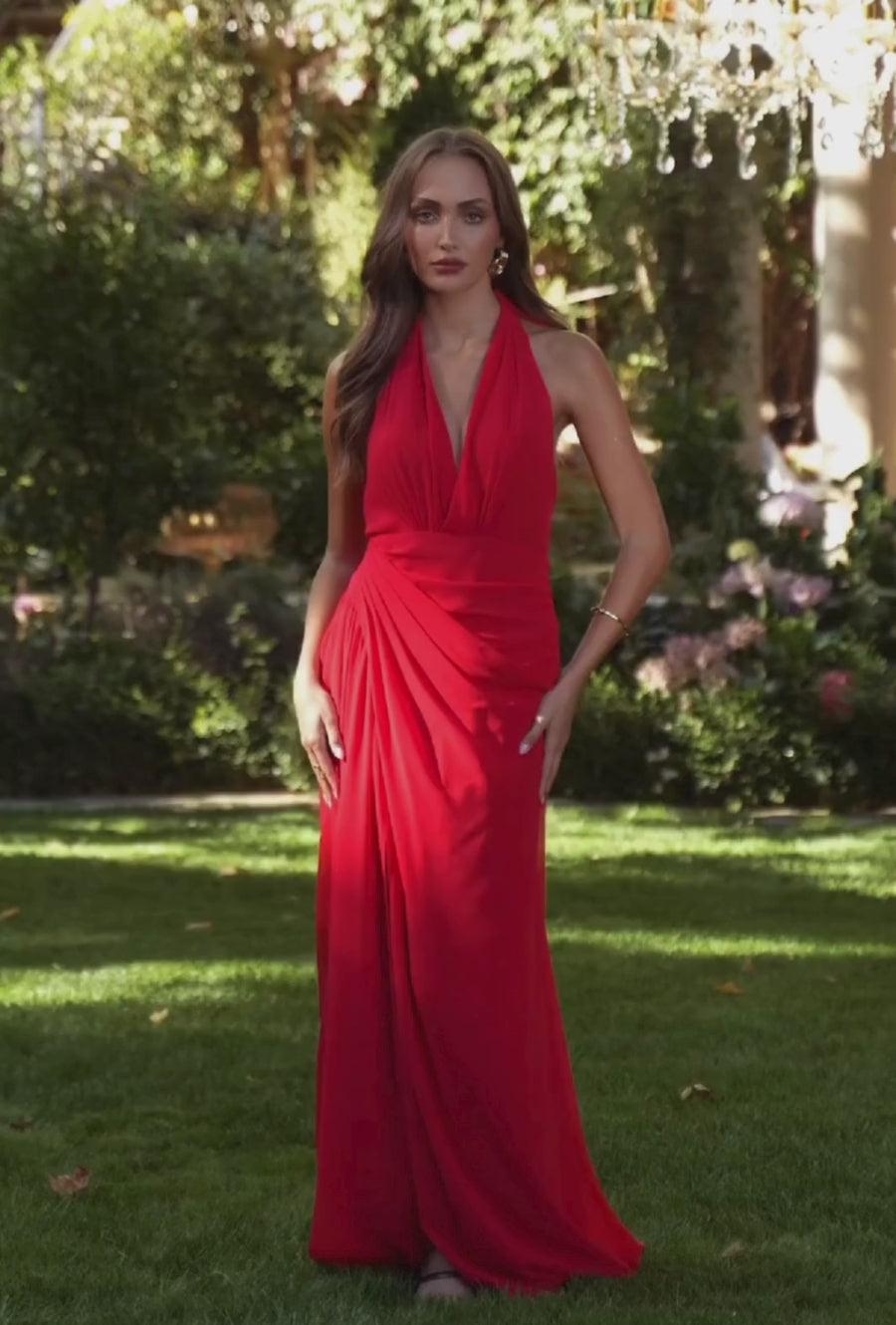 Elegant and effortlessly flattering, this halter chiffon gown features a plunging neckline with softly gathered draping along the waist and hips. The floor-length skirt flows beautifully with every step, while a side split adds a touch of modern edge. Finished with a self-tie bow at the neck and a sleek open back, this dress is perfect for weddings, proms, or sunset soirées.