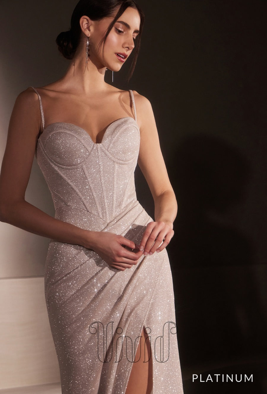Dazzle under the lights in this fitted gown, featuring a sweetheart neckline and delicate thin straps for an effortlessly elegant look. Crafted from glitter-dusted fabric, the structured bodice and gathered waistline create a flattering silhouette, while the lace-up corset back ensures a perfect fit. Ideal for prom or formal occasions, this gown shimmers with every step, making a lasting impression.