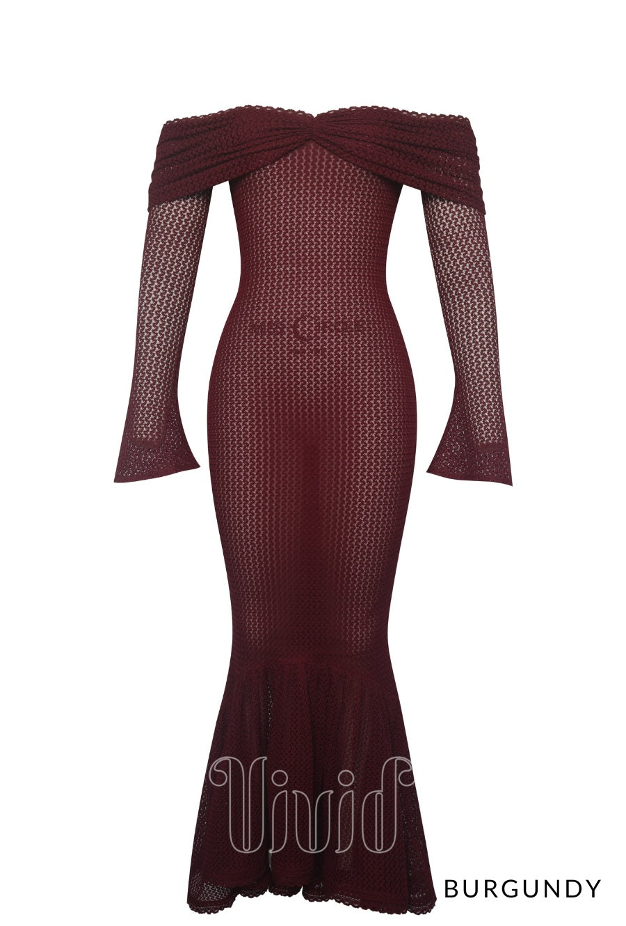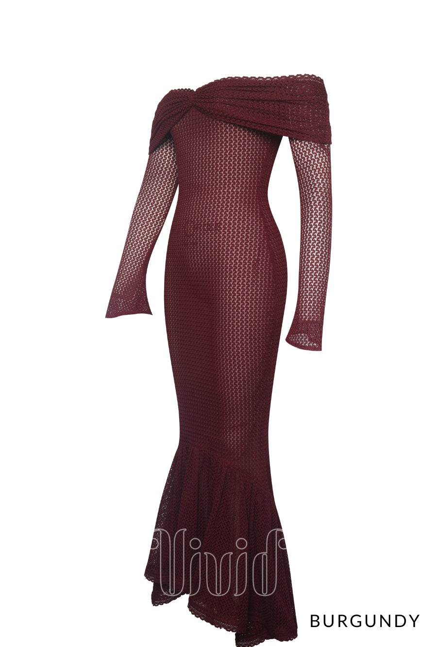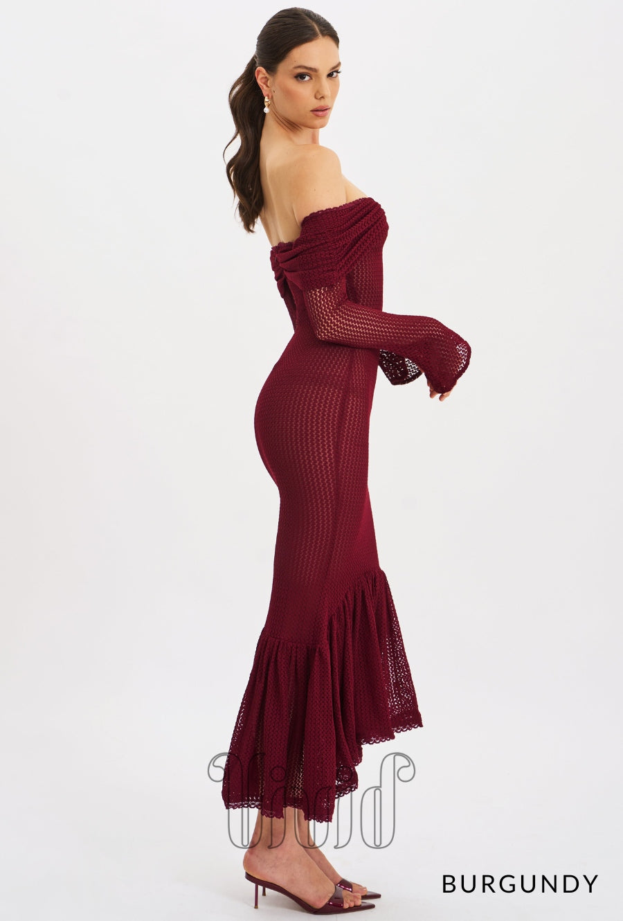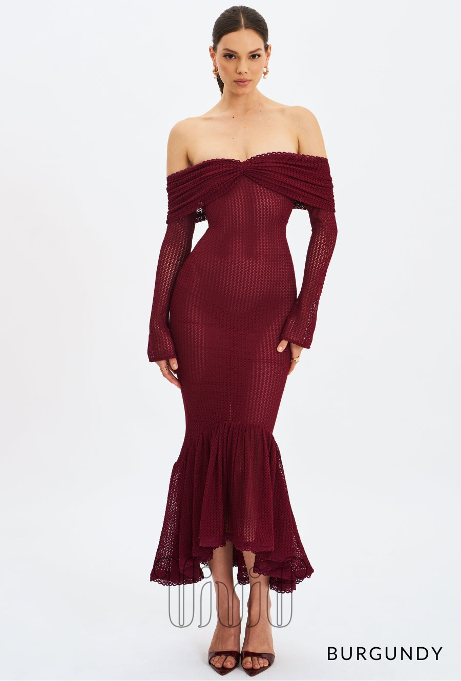 Effortlessly elegant, the Savannah Dress is crafted from stretchable crochet fabric, offering both comfort and a figure-hugging silhouette. This off-shoulder design features dramatic ruched detailing across the neckline and long flare sleeves that add movement and romance. The mermaid silhouette flares gracefully at the hem with a flounced bottom skirt, creating a flattering and timeless shape. Finished with an invisible zipper for a seamless fit, Savannah is perfect for occasions that call for soft sophistication and statement style.