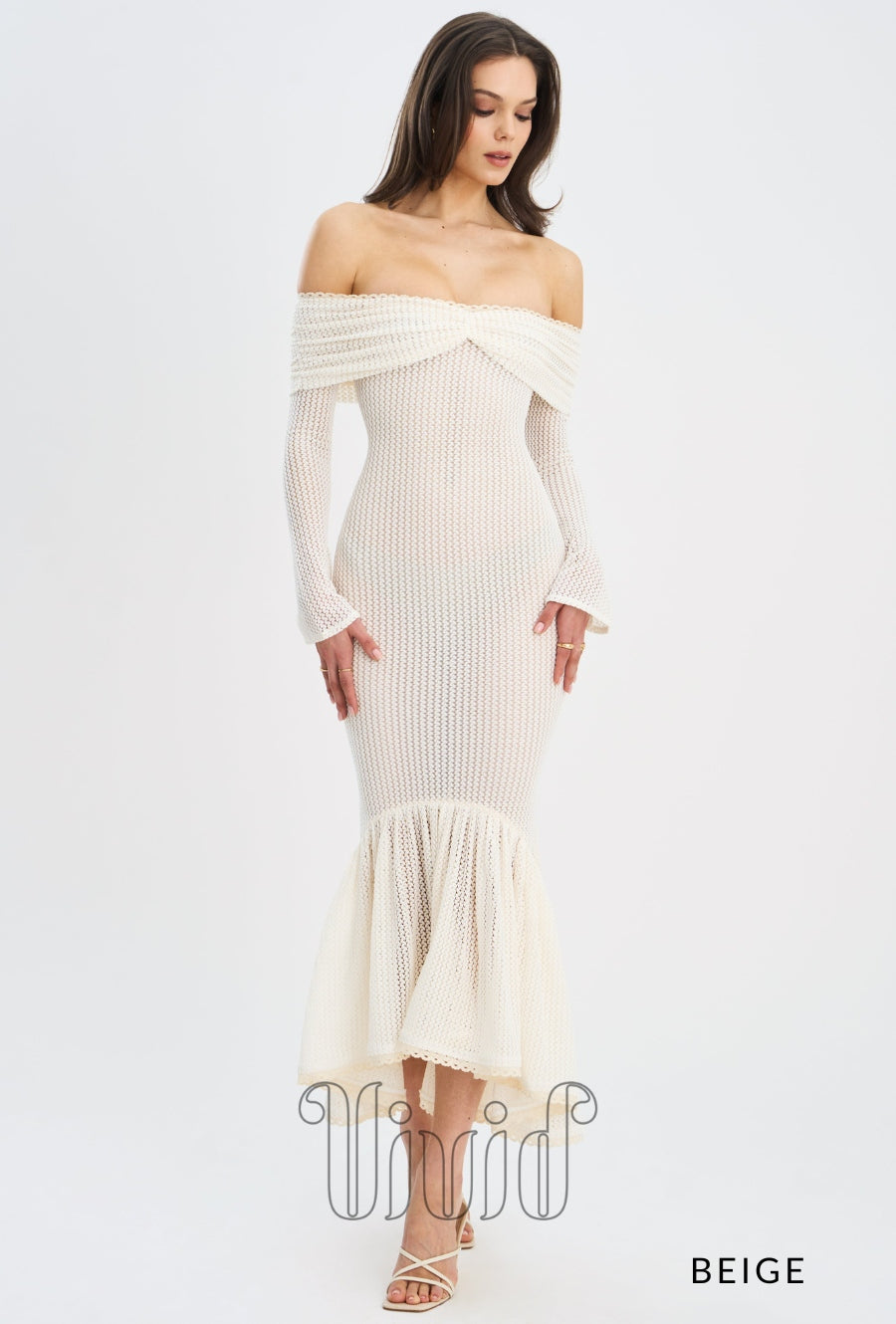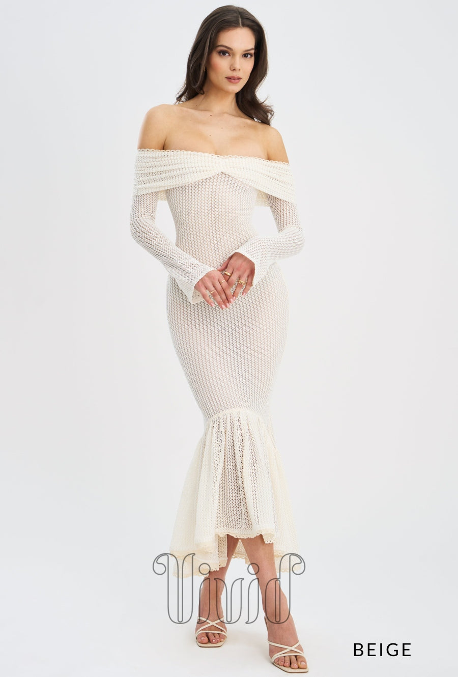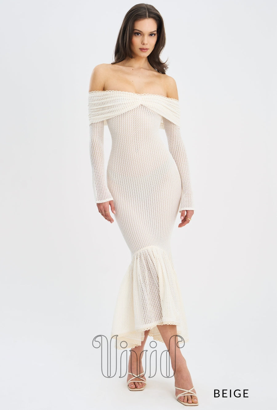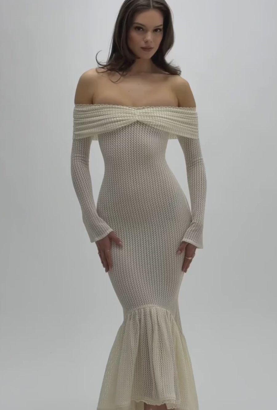 Effortlessly elegant, the Savannah Dress is crafted from stretchable crochet fabric, offering both comfort and a figure-hugging silhouette. This off-shoulder design features dramatic ruched detailing across the neckline and long flare sleeves that add movement and romance. The mermaid silhouette flares gracefully at the hem with a flounced bottom skirt, creating a flattering and timeless shape. Finished with an invisible zipper for a seamless fit, Savannah is perfect for occasions that call for soft sophistication and statement style.