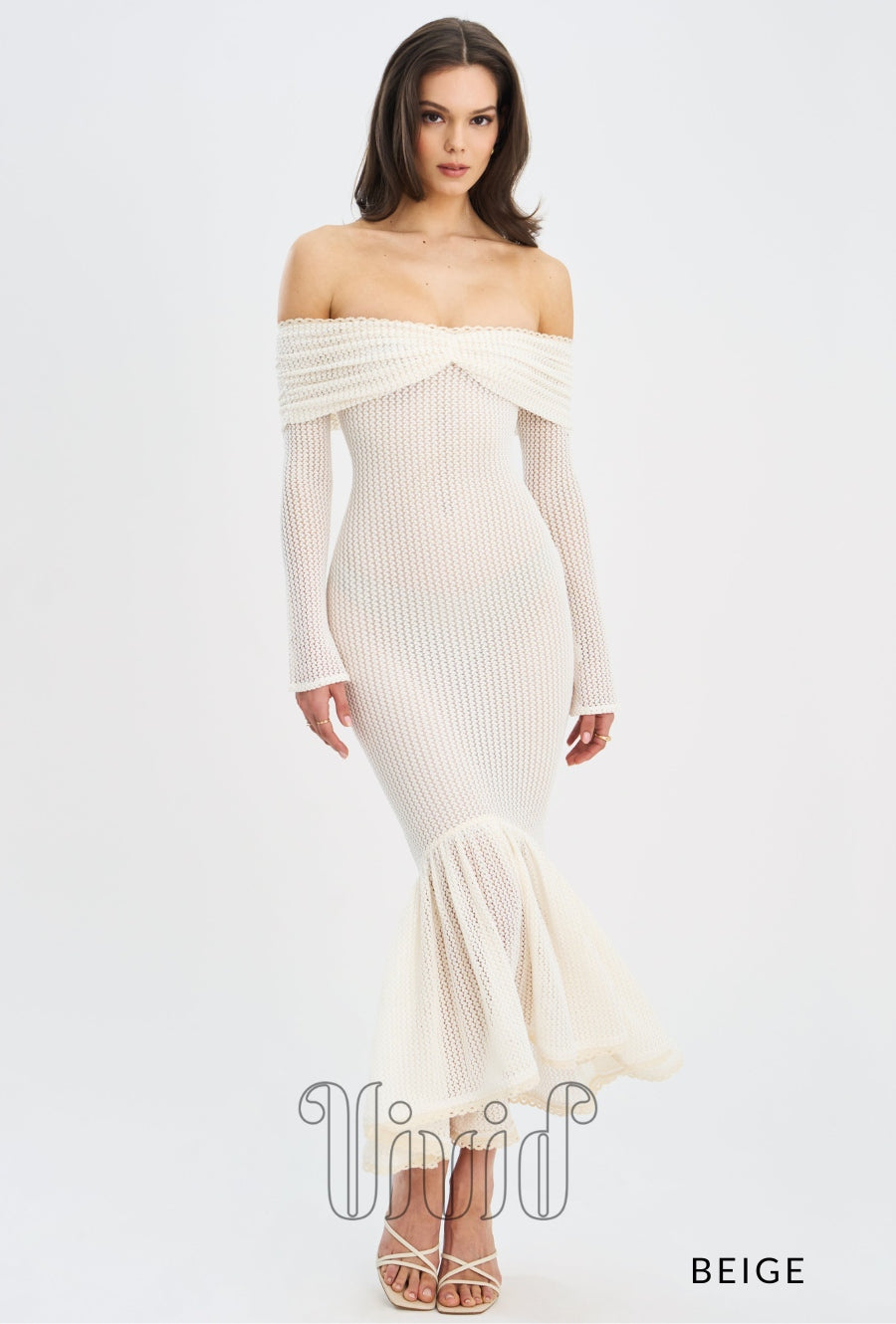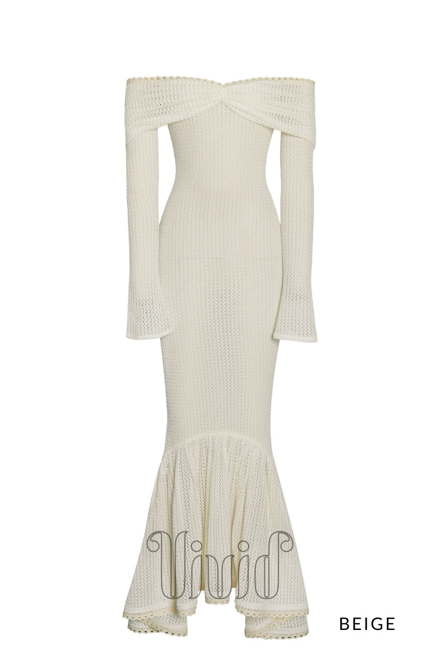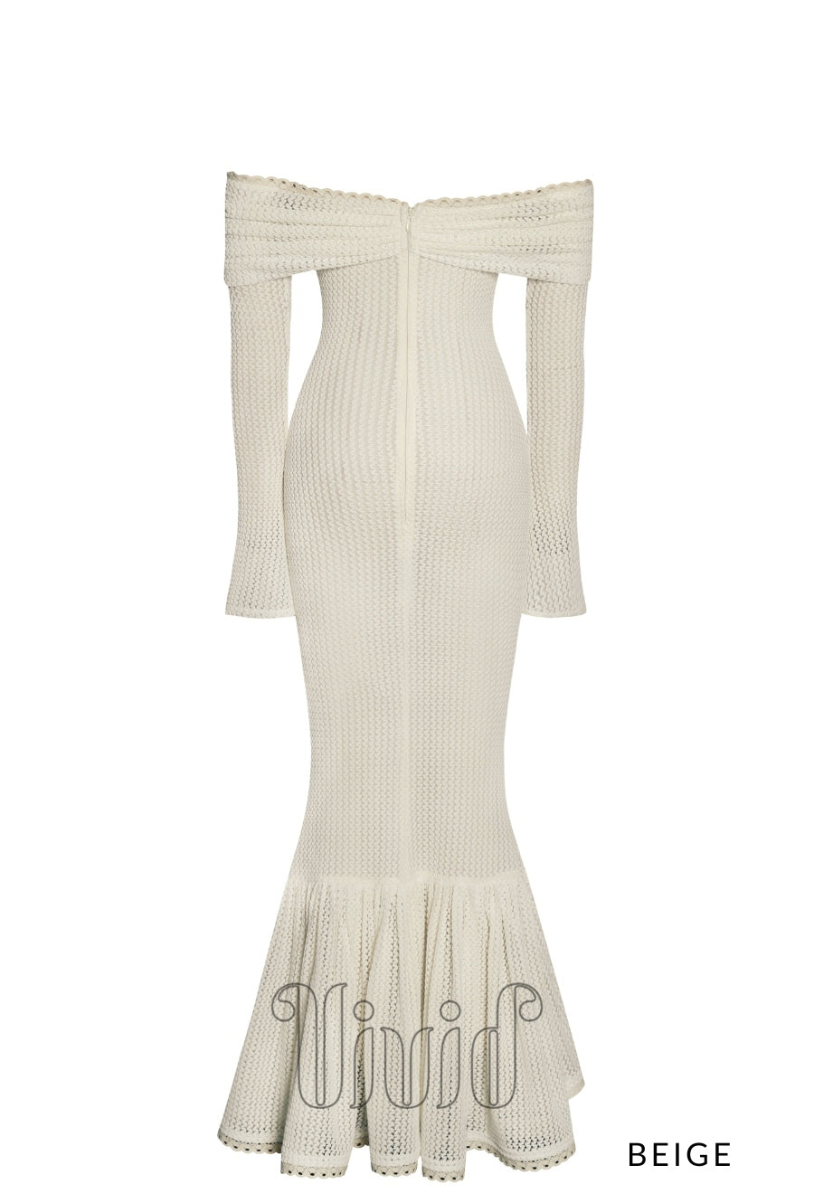 Effortlessly elegant, the Savannah Dress is crafted from stretchable crochet fabric, offering both comfort and a figure-hugging silhouette. This off-shoulder design features dramatic ruched detailing across the neckline and long flare sleeves that add movement and romance. The mermaid silhouette flares gracefully at the hem with a flounced bottom skirt, creating a flattering and timeless shape. Finished with an invisible zipper for a seamless fit, Savannah is perfect for occasions that call for soft sophistication and statement style.