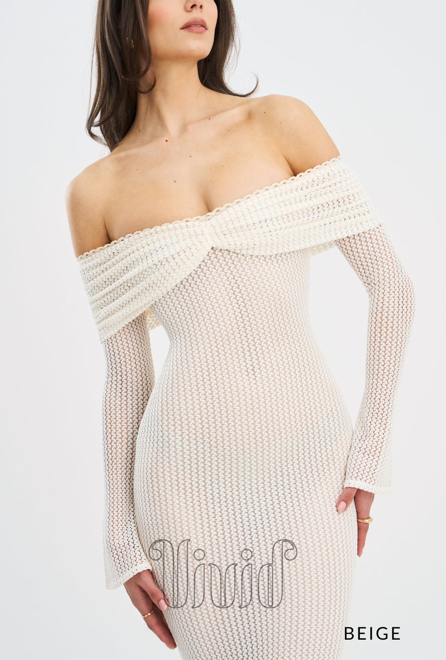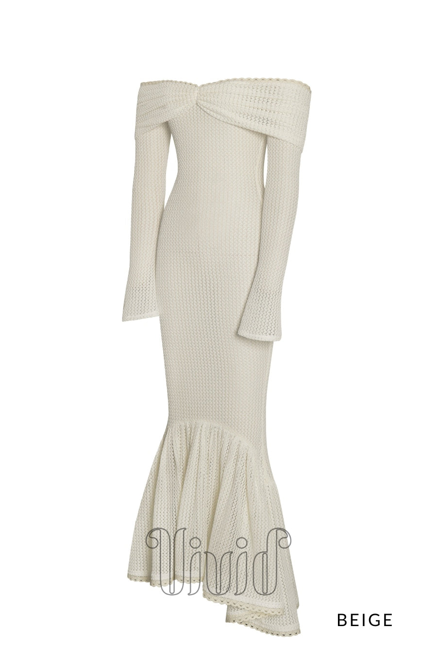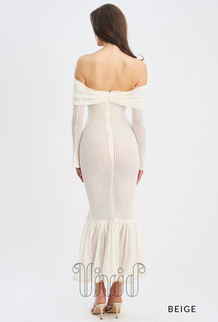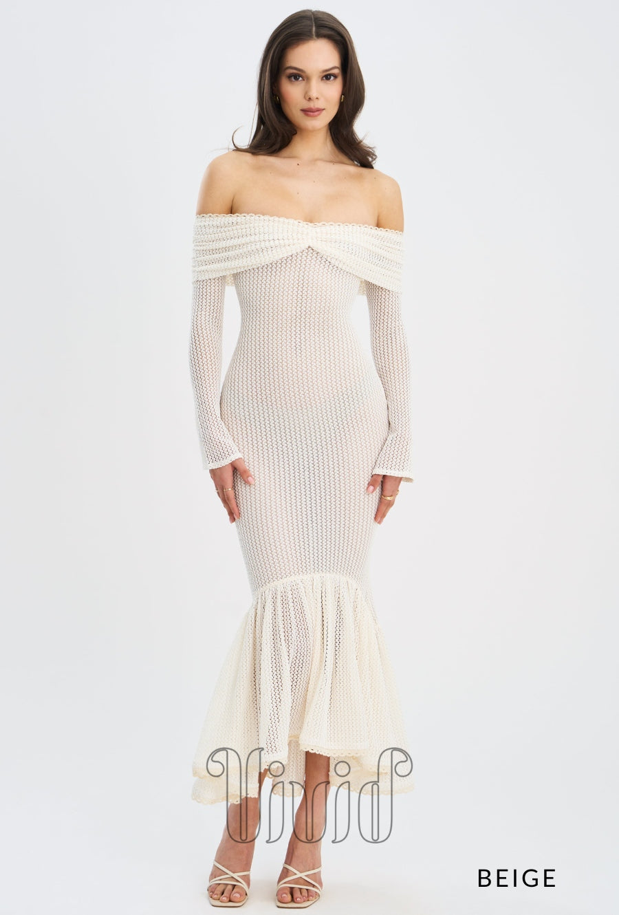 Effortlessly elegant, the Savannah Dress is crafted from stretchable crochet fabric, offering both comfort and a figure-hugging silhouette. This off-shoulder design features dramatic ruched detailing across the neckline and long flare sleeves that add movement and romance. The mermaid silhouette flares gracefully at the hem with a flounced bottom skirt, creating a flattering and timeless shape. Finished with an invisible zipper for a seamless fit, Savannah is perfect for occasions that call for soft sophistication and statement style.